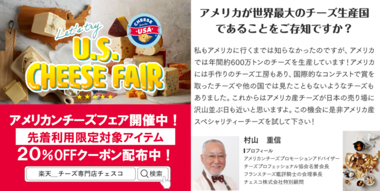 楽天市場にてアメリカンチーズフェア開催中! 対象アイテム1,000円(税込)以上購入で20%OFFになるクーポンを配布中です。 クーポン獲得期間:2022年10月20日(木)10:00~2022年12月12日(月)09:59 クーポン利用期間:2022年10月20日(木)10:00~2022年12月12日(月)09:59 お得なこの機会に、アメリカ産のチーズをお試しください。 ご購入は【楽天】チーズ専門店チェスコ オンラインショップへ! 詳細はキャンペーンページをご確認ください。