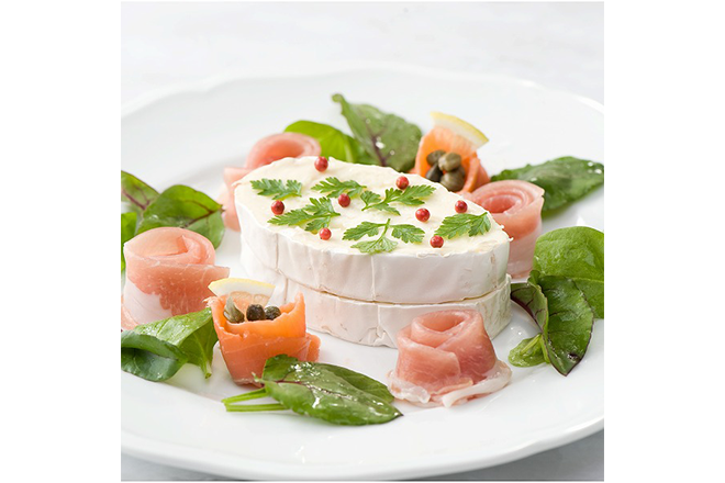 周りに生ハム、スモークサーモン、洗ったセルフィーユなどを添える。