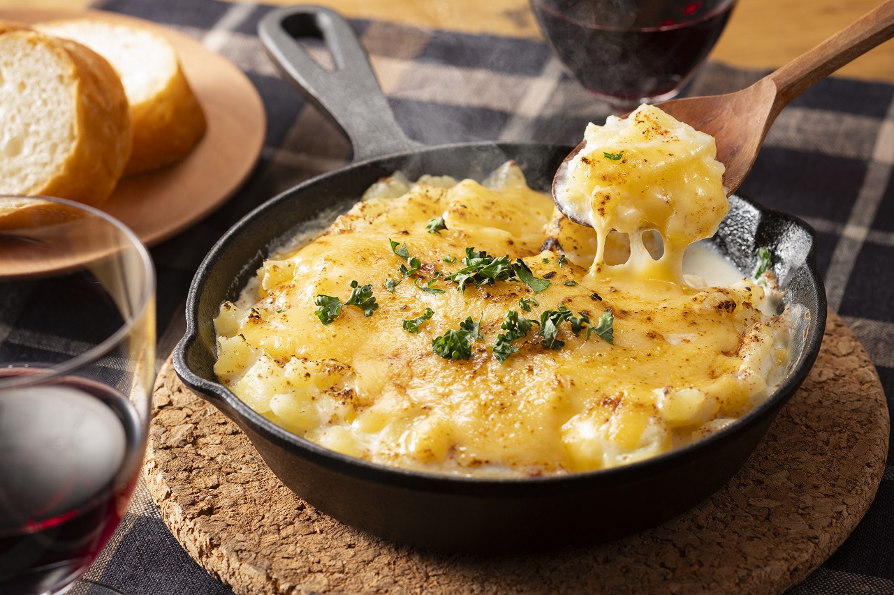 じゃがいもが柔らかくなってとろみがついたら、塩・こしょうで味を調える。ナツメグを振って贅沢シュレッドチーズを散らし、トースターで焦げ目がつくまで焼く。