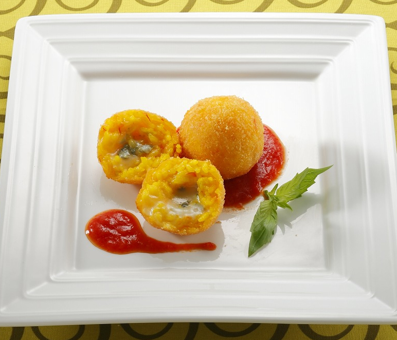 10等分した③の真ん中にゴルゴンゾラピカンテを詰めて丸め、薄力粉、溶き卵、パン粉の順にまぶして180℃の油できつね色になるまで揚げる。お好みでトマトソースとバジルを添える。
