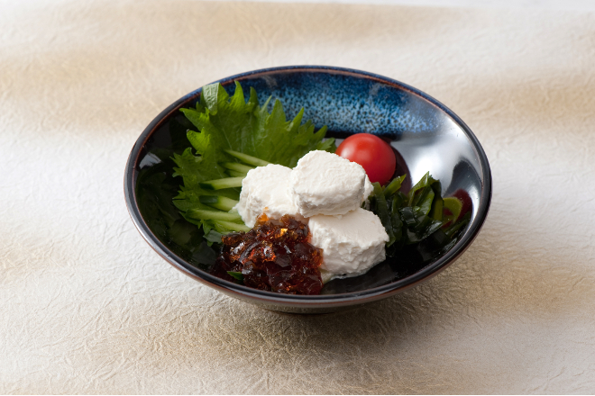 ポン酢しょうゆゼリーと細ネギの小口切りをのせて、ミニトマト、ワカメを添える。